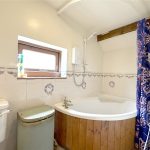 The family bathroom continues the cottage's charming aesthetic, featuring a corner bath with electric shower over, a matching WC, and a sink with vanity unit for handy storage.