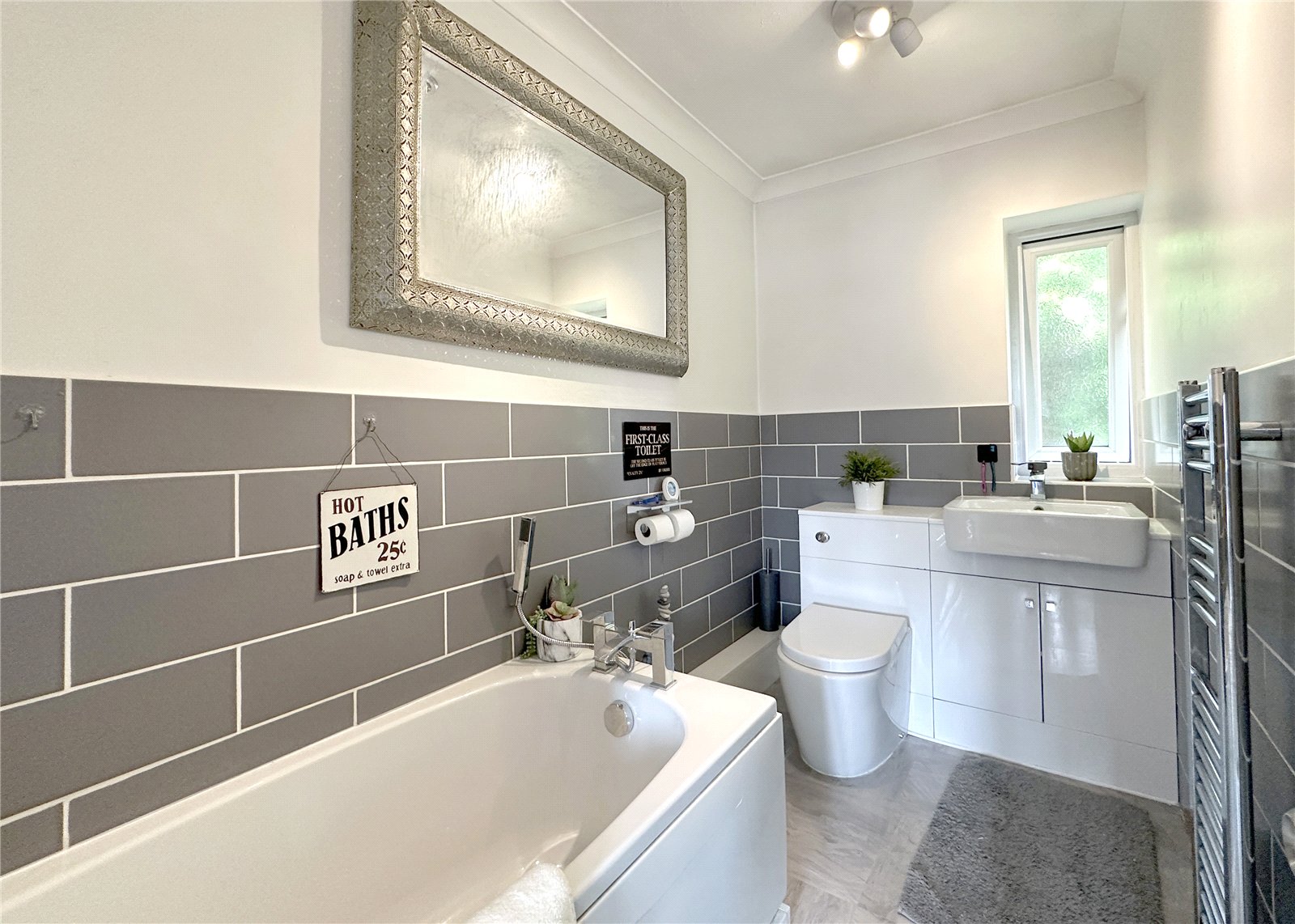 The principal bedroom en-suite is super modern and stylish, offering a bath with mixer tap and shower attachment, a white vanity unit for storage, with wash basin and WC. The en-suite has easy to clean tiling around the wet areas, easy to manage flooring, and a frosted leaf-patterned open window to the rear elevation. There’s also a slimline electric towel ladder radiator.