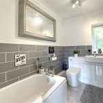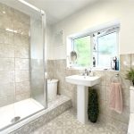The principal bedroom en-suite is super modern and stylish, offering a bath with mixer tap and shower attachment, a white vanity unit for storage, with wash basin and WC. The en-suite has easy to clean tiling around the wet areas, easy to manage flooring, and a frosted leaf-patterned open window to the rear elevation. There’s also a slimline electric towel ladder radiator.