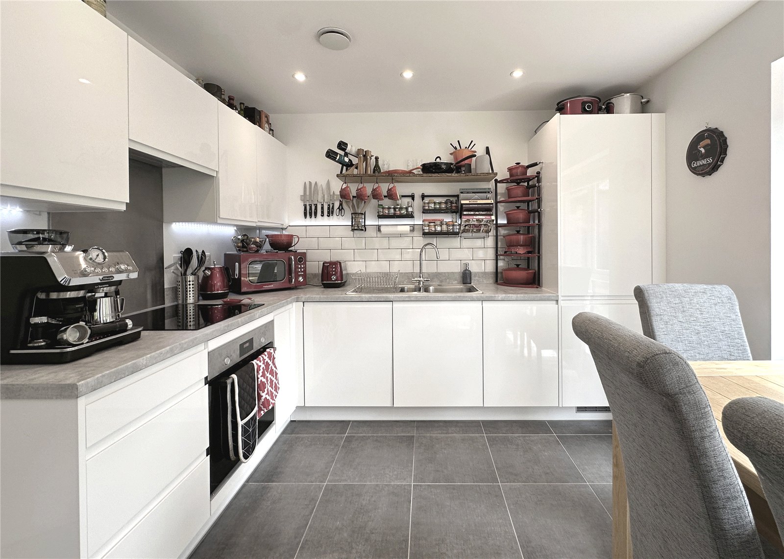 The kitchen features handleless high-gloss units, a concrete-effect worktop, real tile flooring and integrated appliances including a fridge-freezer, dishwasher, oven, hob and extractor. Subway-style tiling and under-cabinet lighting add to the charm of the kitchen.