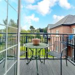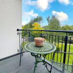 The balcony is a standout feature of this home, providing a serene outlook over tree-lined gardens. With ample room for a bistro set, it is the ideal spot for alfresco dining or simply enjoying the outdoors. An overhead electric awning ensures year-round use, providing welcome shade from the summer sun or shelter from a light shower.