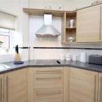 From the lounge diner, elegant French-style double doors open directly into the kitchen, creating a sense of openness and connectivity. The kitchen is thoughtfully appointed, featuring a full suite of integrated appliances including a fridge-freezer and electric hob with overhead extractor. Its neutral design combines attractive beech-effect cabinetry with contrasting granite style worktops, while a well-placed window above the sink floods the space with natural light.
