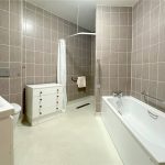 The bathroom is a versatile and well-considered space, designed with both comfort and functionality in mind. Its layout allows room for bathing aids if required, while offering modern fitted amenities including a large bathtub, a sleek vanity unit with WC, and a separate walk-in electric shower complete with wall-mounted seating. Grey tiled walls and waterproof vinyl flooring make the room both stylish and easy to maintain.