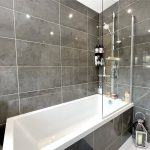 The principal en-suite is modern, offering a white Roca suite comprising of WC with dual flush, a floating vanity cabinet with sink and mixer tap, an LED vanity mirror set beyond, as well as a single sized shower being mains-fed complimented by a glass shower door. The en-suite offers tasteful tiling, contrasting around the wet areas, as well as having a shaver point, a good shelf for toiletries and a ladder radiator.