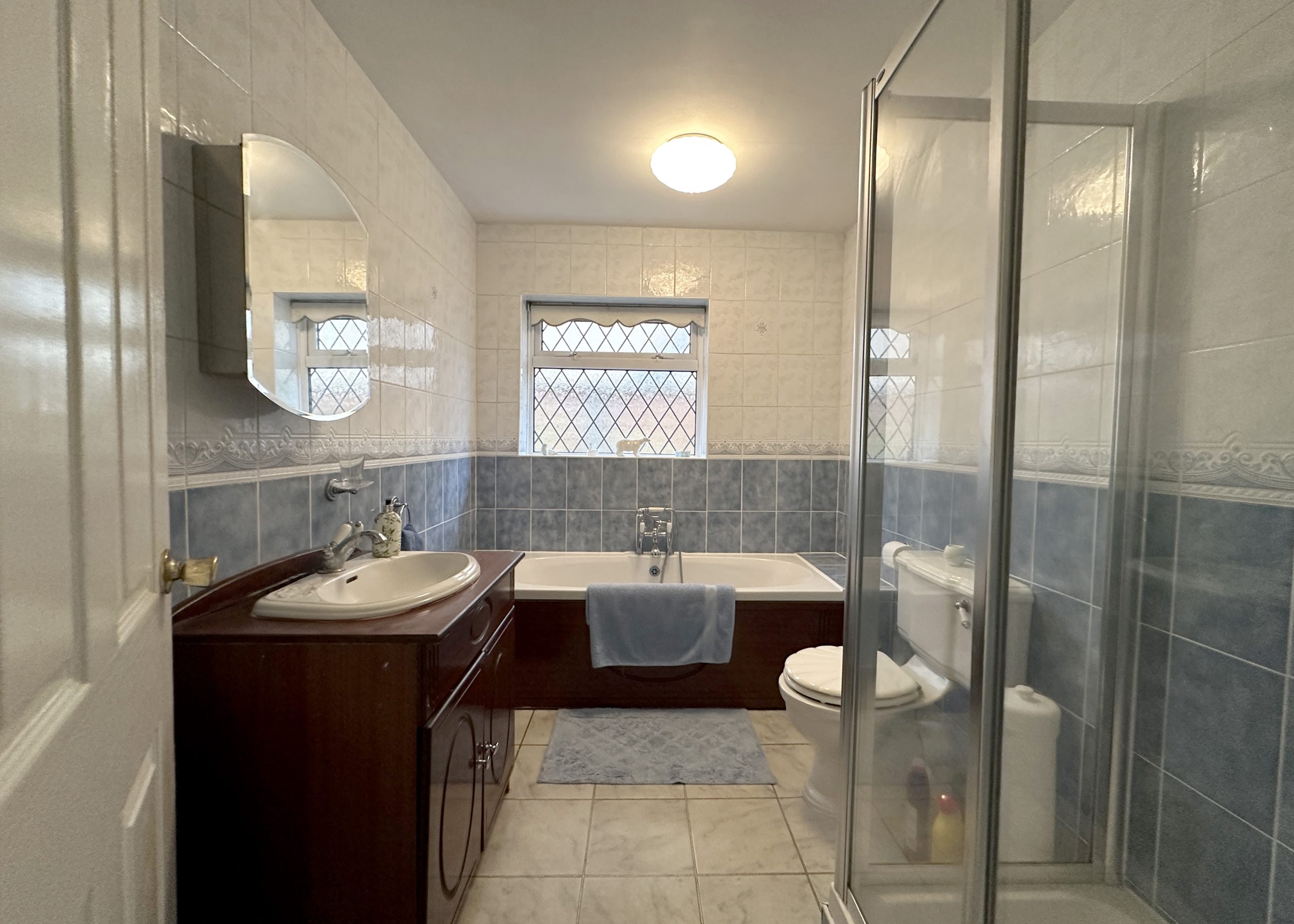 The bathroom is equally impressive, featuring a large vanity unit, bath, separate shower cubicle, and WC, all finished in a spacious and practical layout.