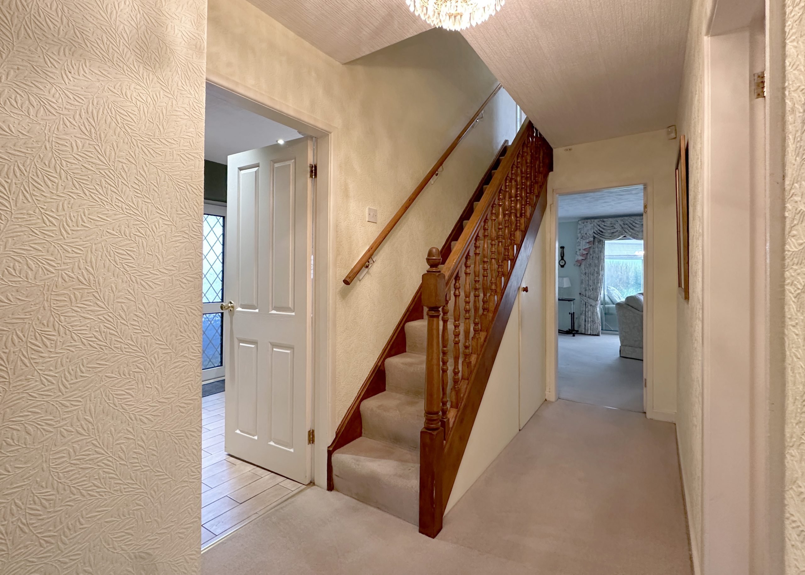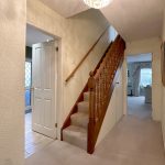 The entrance hall is spacious, warm, and inviting, offering access to all ground-floor rooms. A discreet utility area provides space for a stacked washer and dryer.