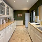 The kitchen is smartly presented with tiled flooring, white cabinetry, beach-effect worktops, and excellent storage. Integrated appliances include an oven, dishwasher, gas hob and a sink overlooking the passageway. A side door provides direct access outside.