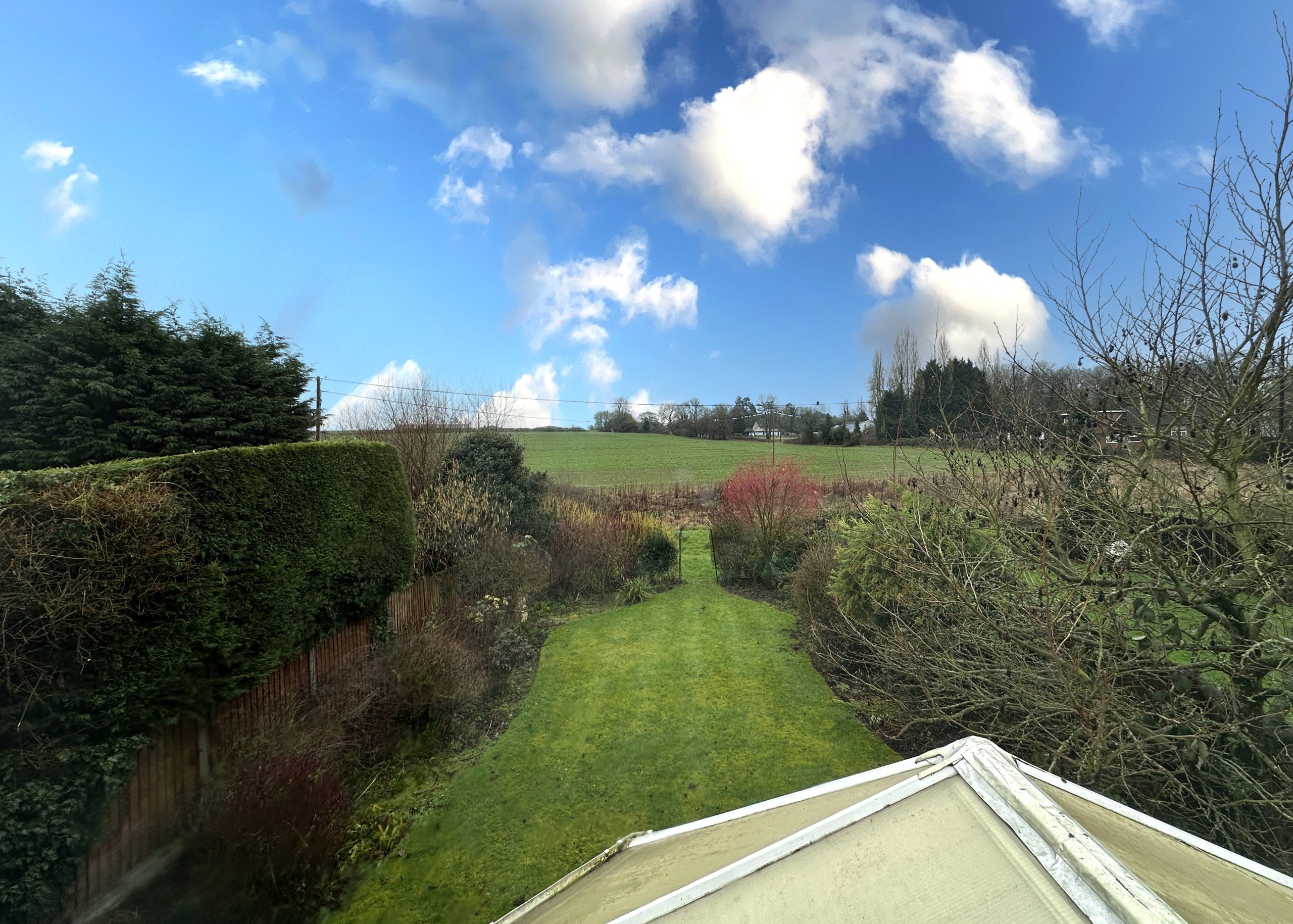 The rear garden is a thoughtfully planted gardener’s haven, with mature borders, a central lawn, and uninterrupted countryside views beyond. It’s a tranquil and private outdoor space that truly complements the home.