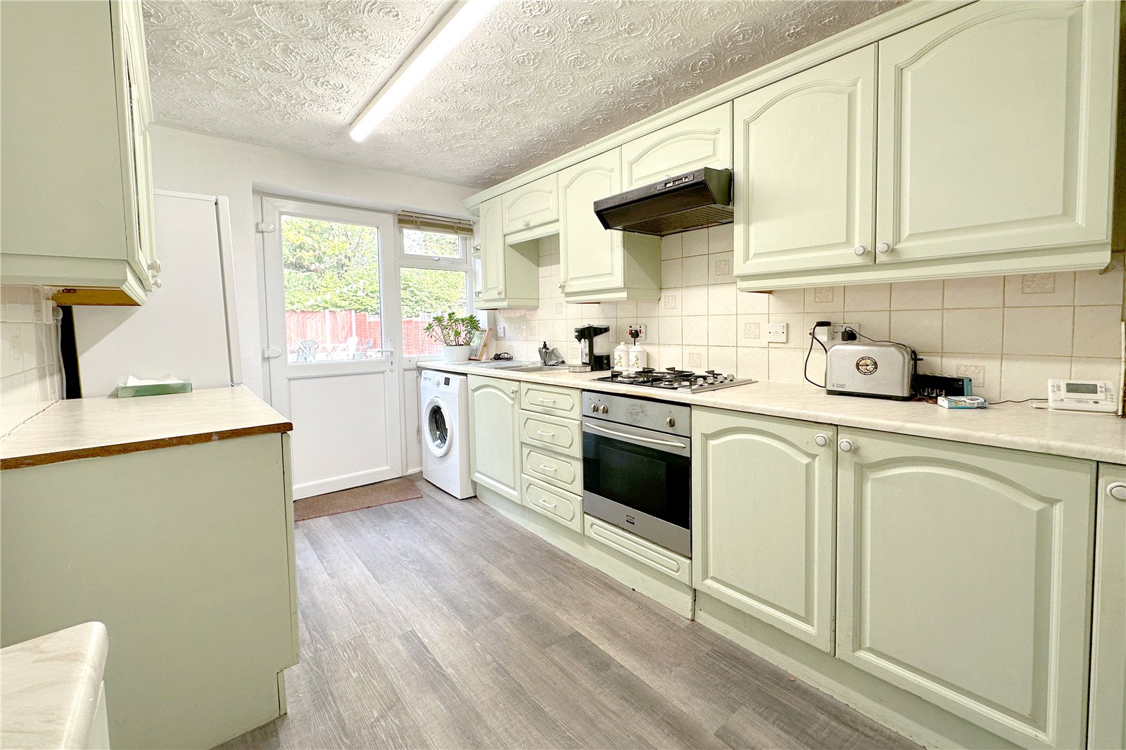 The kitchen is well-equipped with a range of wall and base units, offering generous workspace and storage. There’s an integrated oven and gas hob with extractor above, plus provisions for a washing machine and fridge freezer. The central heating boiler is also located here. The layout and size make this a highly functional and versatile cooking space. There is an abundance of worktop prep space. Additionally there us a rear door leading out to the patio.