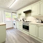 The kitchen is well-equipped with a range of wall and base units, offering generous workspace and storage. There’s an integrated oven and gas hob with extractor above, plus provisions for a washing machine and fridge freezer. The central heating boiler is also located here. The layout and size make this a highly functional and versatile cooking space. There is an abundance of worktop prep space. Additionally there us a rear door leading out to the patio.