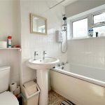 The family bathroom is a bright and welcoming space, finished with simple white tiles that help maximise natural light. It features a bathtub with an electric shower over, a pedestal wash basin, and a WC all combining practicality with a clean, classic look.