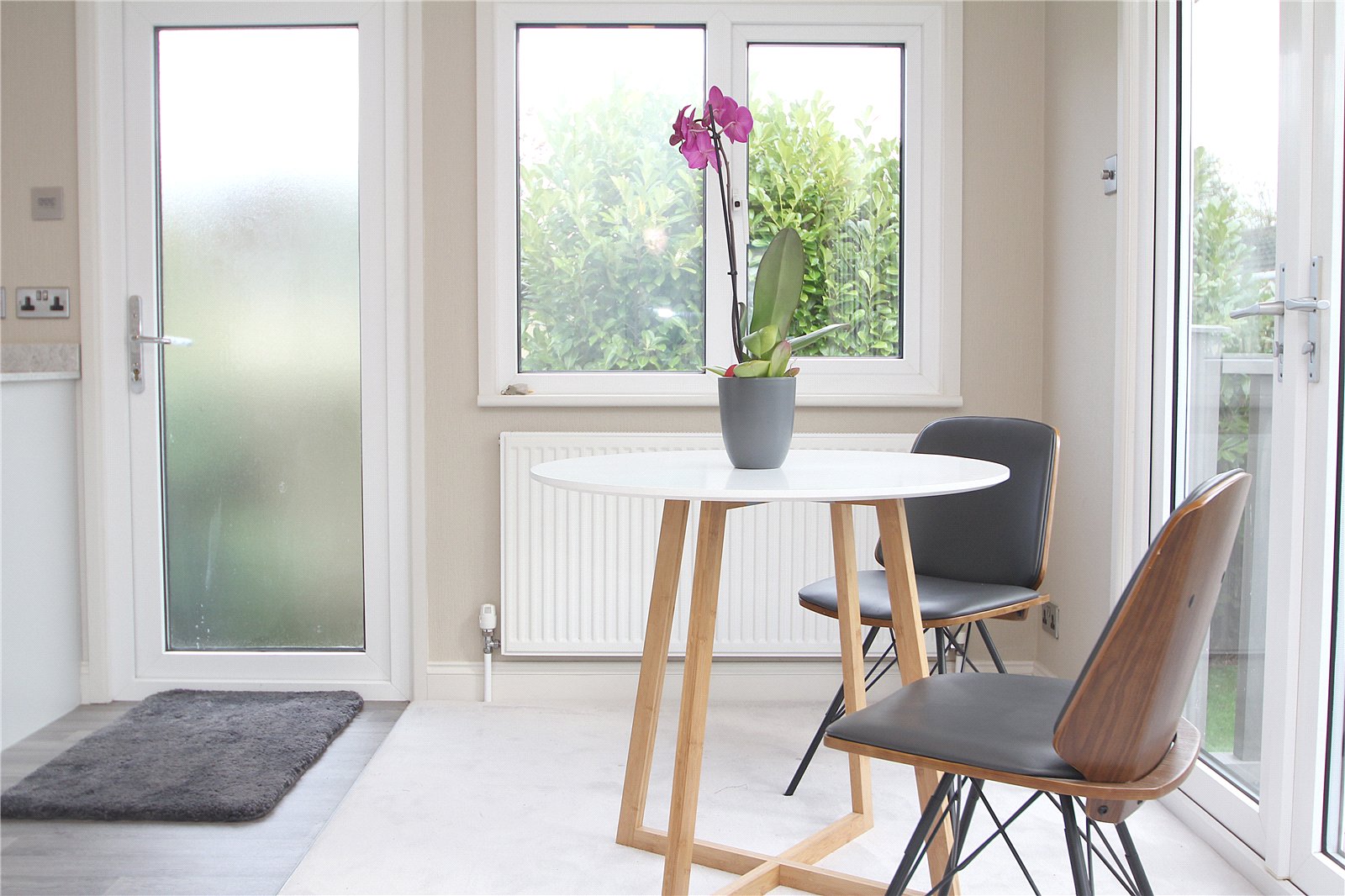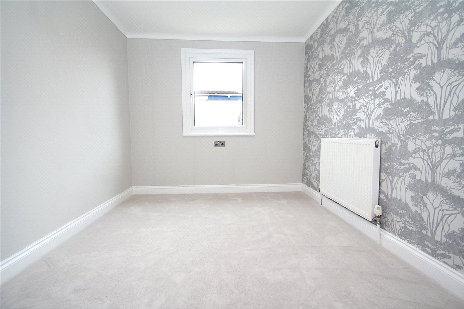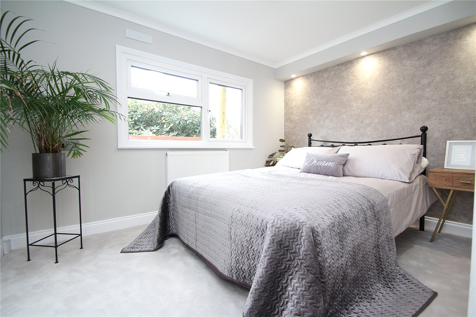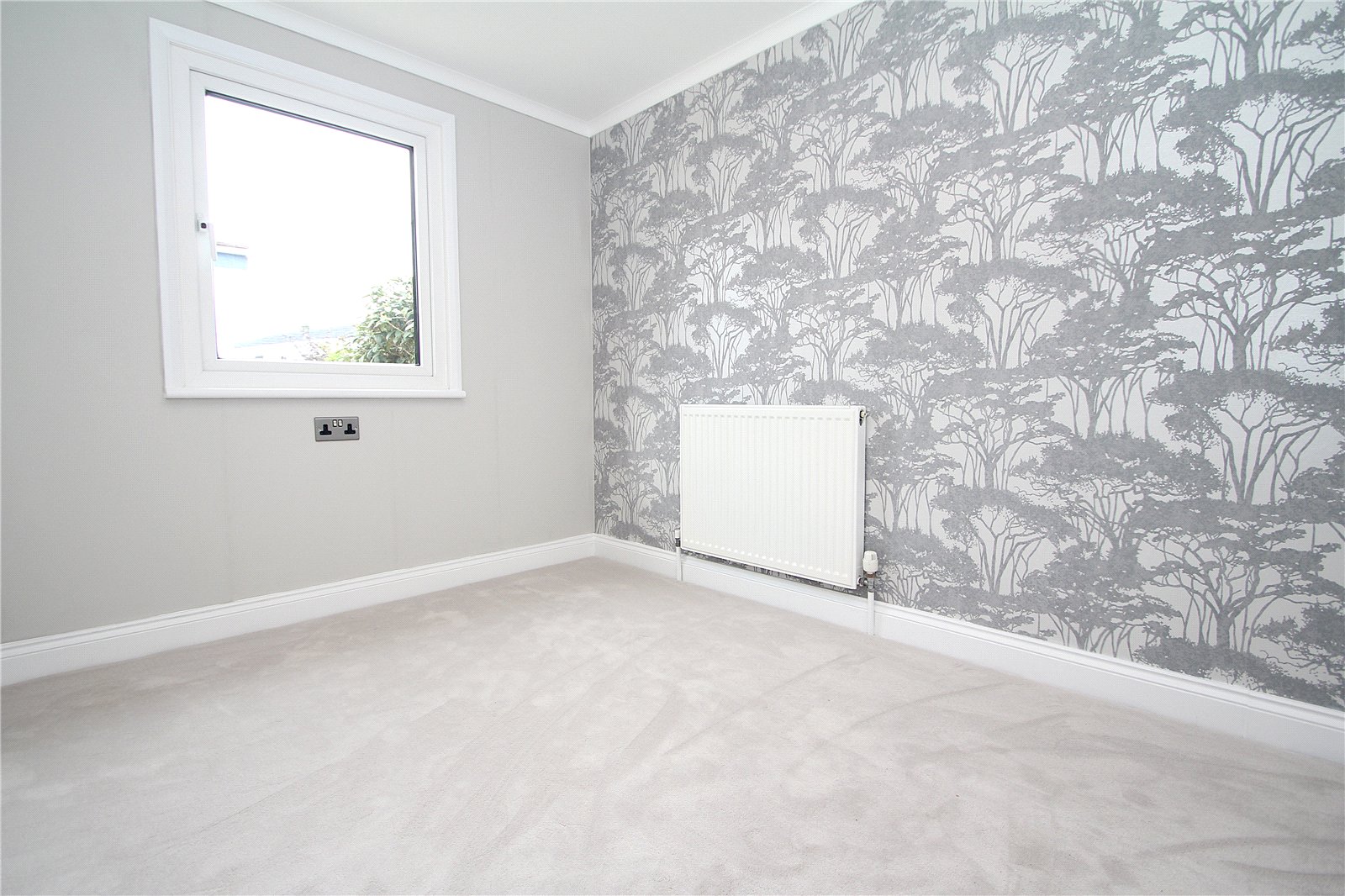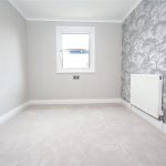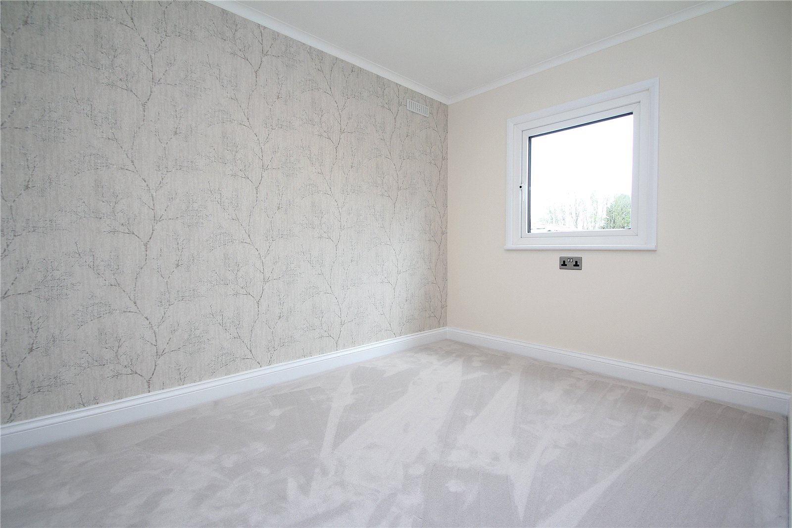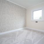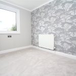 Bedroom number two is also beautifully styled, a light décor with feature wall covering, delivering a lovely bright second bedroom. There is a central heating radiator with thermostat control, low and mid-height power points and a larger opening window to the side elevation looking into the garden area.