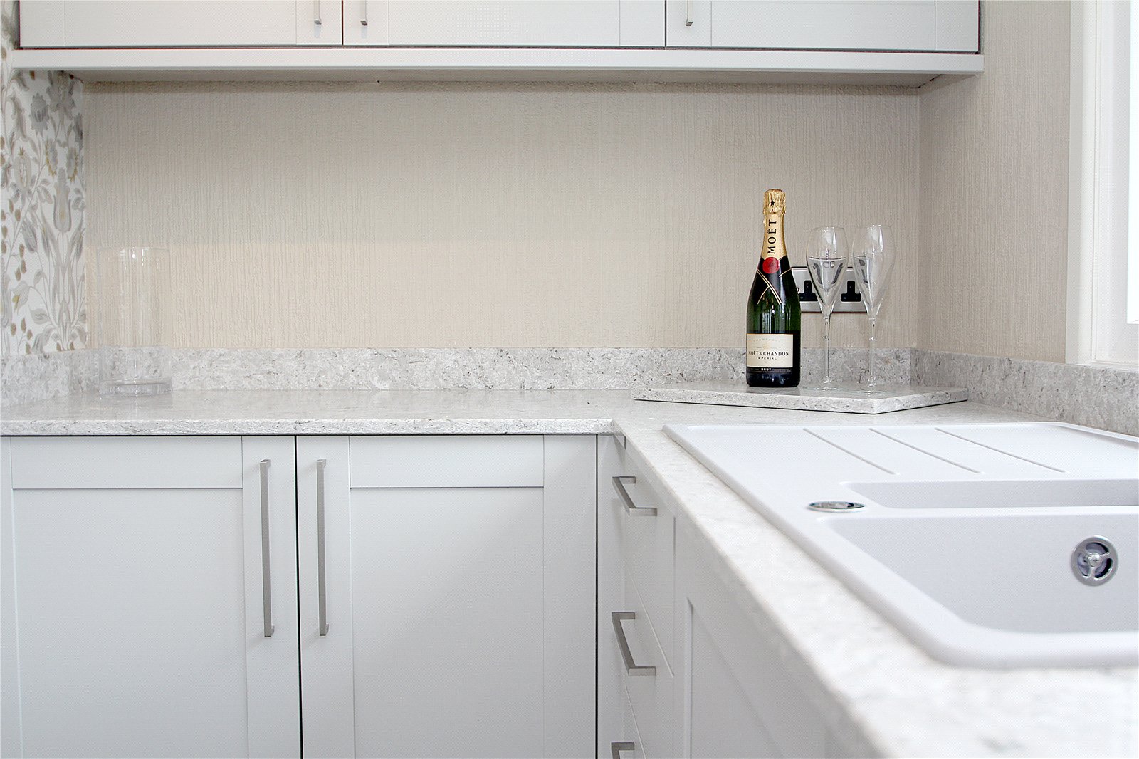 The moment you step through the front door you are greeted by a super spacious and stylish lounge/dining/kitchen area. Being open plan makes for the perfect social area and especially when having friends over. The living area is beautifully styled with feature wall coverings and numerous windows on the two side elevations. The living space offers plenty of floor space for your sofas. chairs, and media centre, as well as having a focal electric fireplace which is remote controlled. A key feature to the living area is the twin French patio doors which open out to the raised decking area which is south-facing as well as having a glass frontage boasting peaceful countryside views into the neighbouring farmers’ fields. Furthermore, there is the perfect spot for your dining table, again to sit and enjoy the country views. The open space enjoys the benefit of two central heating radiators with thermostat control, plenty of power points, TV aerial point, and also a socket for your telephone/Internet. The room is lovely and bright with a combination of ceiling and wall lighting and vinyl flooring around the kitchen area. The kitchen has been re-fitted to offer light grey modern fitments providing a good compliment of wall and base units and contrasting granite work- surface. Having a 1 and a 1/2 Lamona sink and drainer with chrome mixer tap, Lamona 4-ring electric hob, accompanied by a Lamona single oven with grill, and having the benefit of an integrated washing/drying machine, fridge and separate freezer. There’s also plenty of space around the work-surfaces for your small appliances and numerous power points for them.